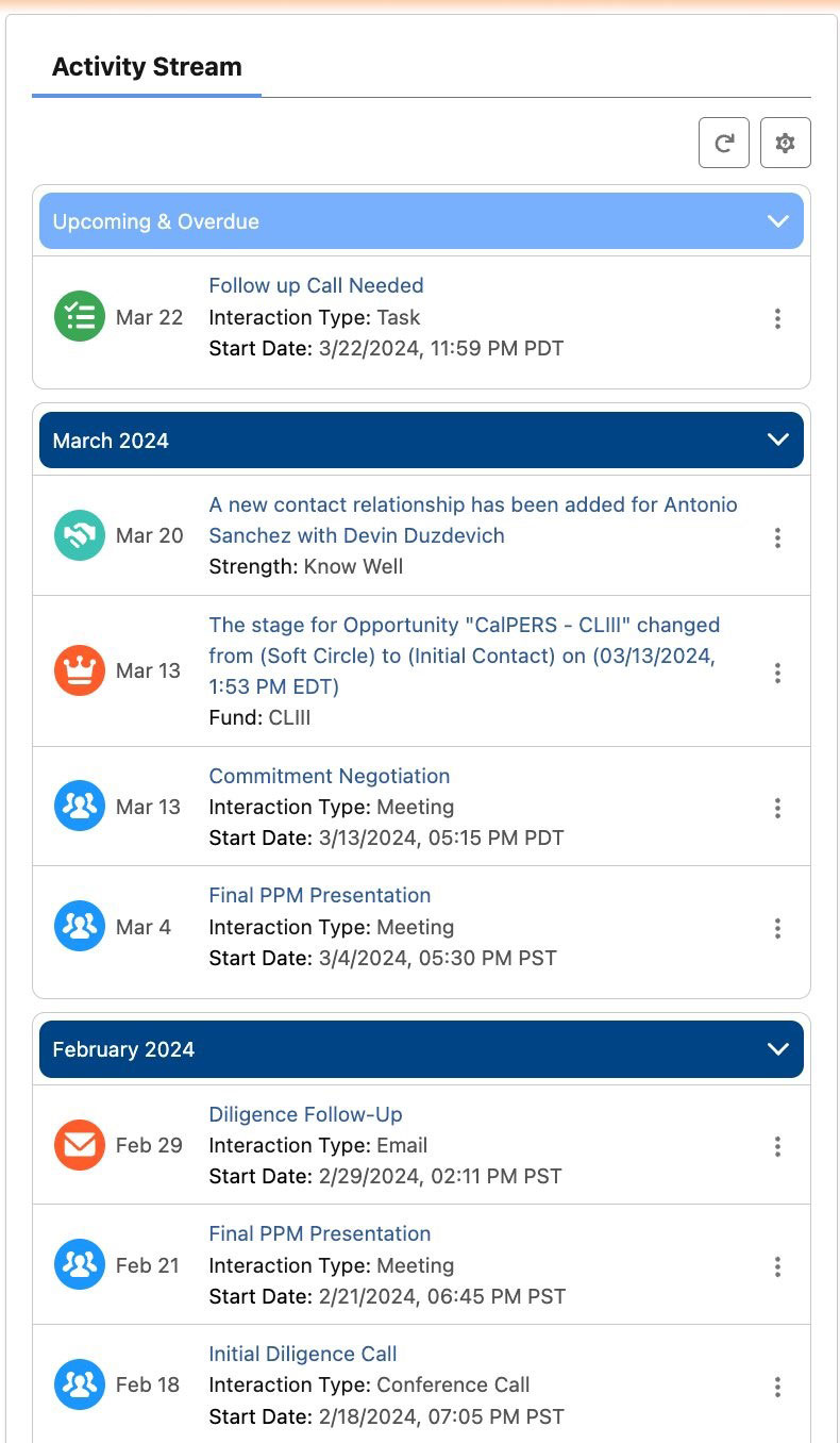 In the world of dealmaking and fundraising, staying on top of every interaction and milestone is crucial. Now, InvestorFlow introduces Activity Stream—a dynamic visual representation of upcoming meetings, open tasks, status changes of cases, and changes to pipeline. With Activity Stream, users can ensure that no detail slips through the cracks, keeping teams informed and proactive every step of the way.